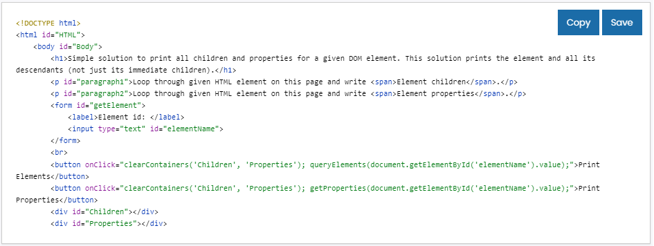 Perhaps every serious web developer has had to search the Document to find a certain element, intercept it, determine its inheritors and properties, and pass them to another function. The present simple solution facilitates these activities by printing the descendant elements (not just the immediate children) and the properties of an element. Type an element ID in the selection box.
